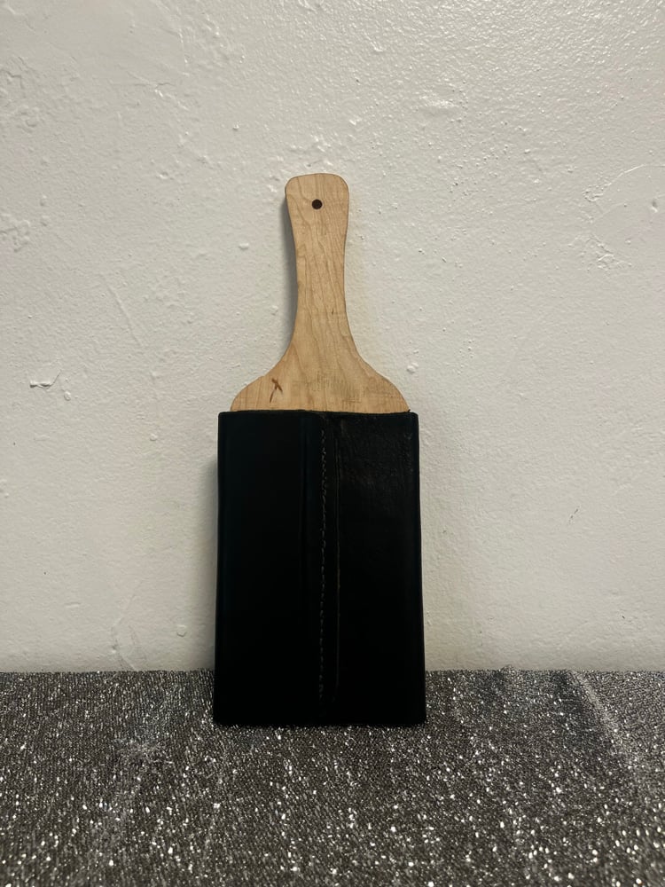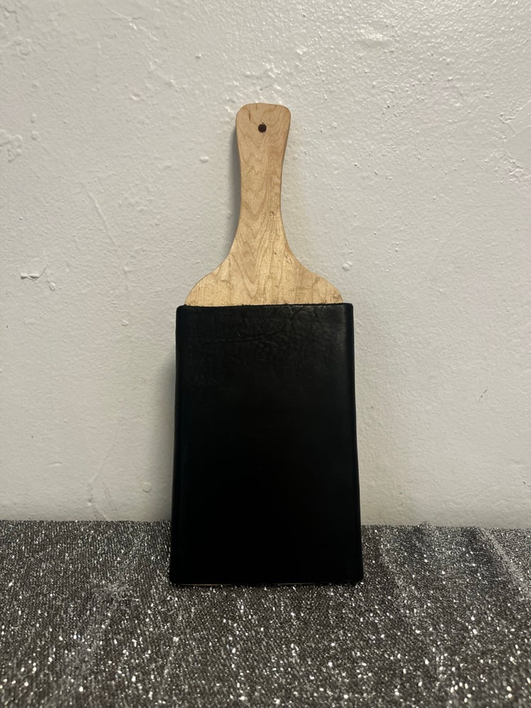 Oak paddle with a nice heavy THUD. Cut, planed and sanded then sheathed with a hand sewn leather face.